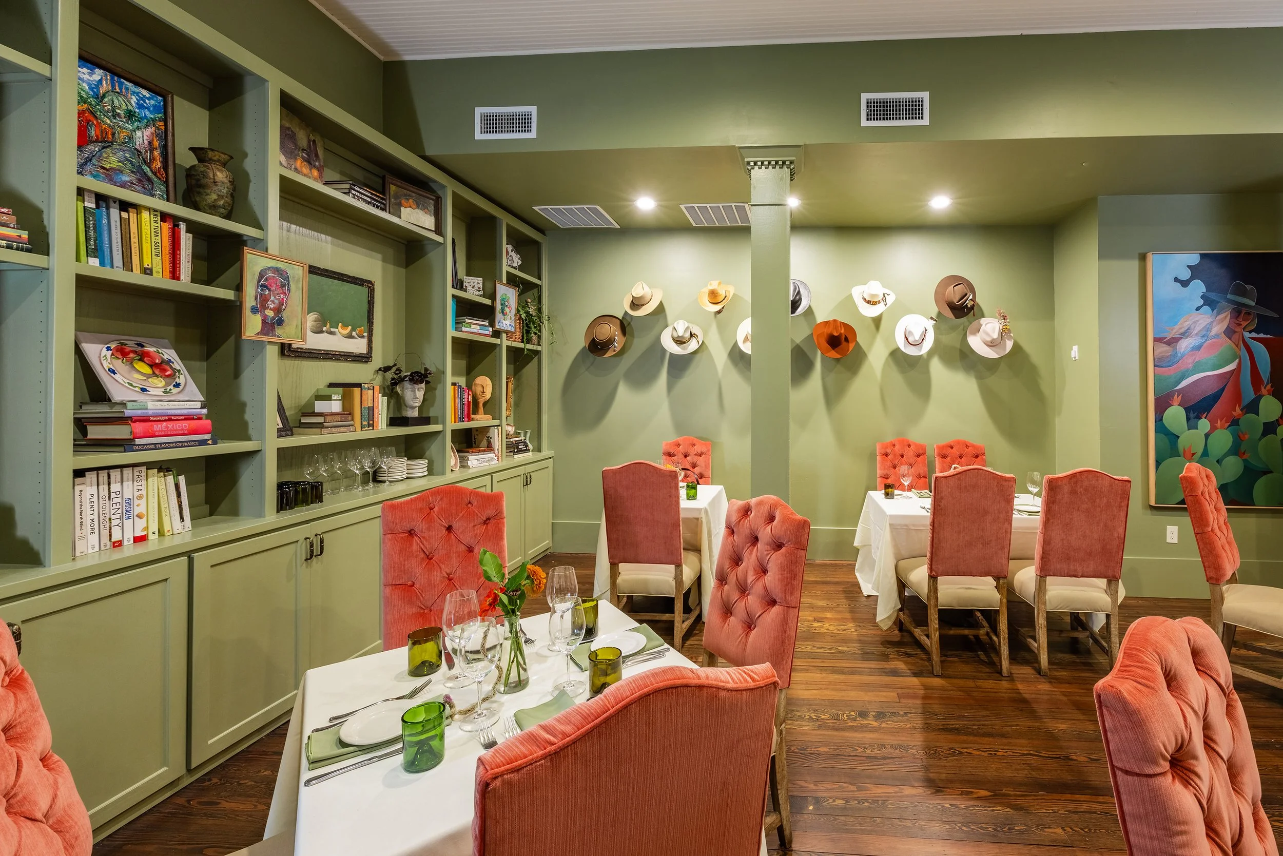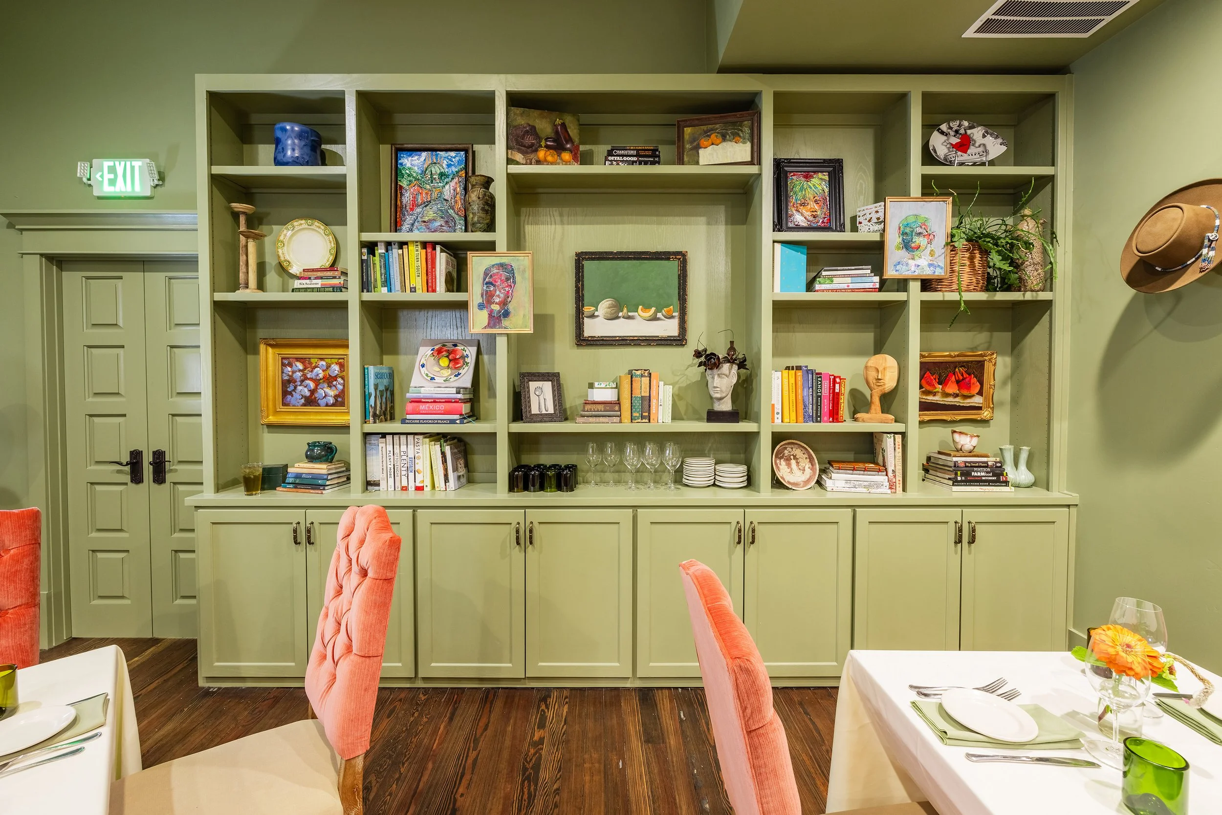 Welcome to my dining room, where every plate is made with passion and every experience is an elevated extension of the original Harvest. The sage walls, antique plates, and velvet chairs will transcend you back to a time on par with our historic building. Curated art and books hand picked by me will give you a small peek into my world. For occasions small or grand, I look forward to serving you.
